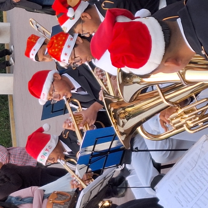 - "A brass band in black suits and Santa hats plays outdoors" by FM-b0Aw43, licensed under CC BY 4.0