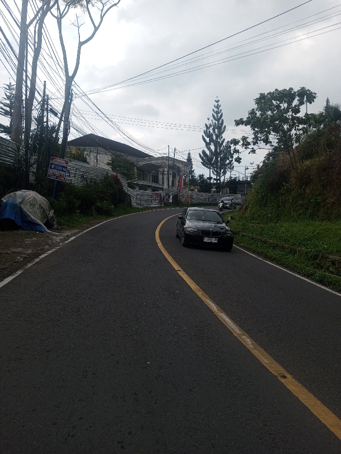 The scene depicts a curved asphalt road in the city of Kalchini, India, under an overcast sky. The road surface is dark gray, featuring a solid yellow line marking the center of the leftward curve and a white line along the left edge. A dark sedan, with license plate "F 1273 JP", is positioned on the right side of the road, appearing to navigate the curve. In the mid-ground on the left, a large, multi-story building, light in color with a darker roof, exhibits classical architectural elements including columns and arches, and shows signs of weathering. Three vertical flags (red, white, blue) are visible near the building's entrance. Adjacent to the road on the left, a partially obscured blue and white sign displaying "700 M" and additional text is present, near some trees. A large object covered by a blue and white tarp lies on the far left shoulder of the road. The right side of the road is bordered by a green embankment covered with dense vegetation and trees. Tall, slender trees, including one with a distinct conical shape, are visible, along with utility poles and numerous overhead wires crossing the sky. Another vehicle is partially visible further down the road on the right. No individuals are discernible. The scene is illuminated by natural light, indicating daytime.