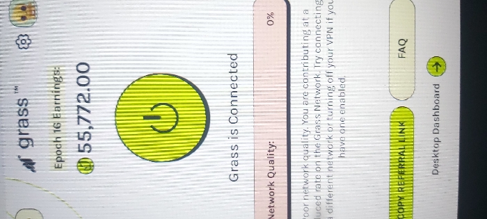The scene displays a digital screen, likely a computer monitor or mobile device, within an unknown indoor location in an unknown city. The screen presents the user interface of an application identified as "Grass." The interface shows "Epoch 16 Earnings: 55,772.00" next to a green circular currency icon. A prominent bright green circular button with a power symbol in its center indicates "Grass is Connected." Below this, a "Network Quality" bar registers "0%," accompanied by a text warning stating, "Poor network quality. You are contributing at a reduced rate on the Grass Network. Try connecting a different network or turning off your VPN if you have one enabled." The lower portion of the screen features a partially visible green button labeled "COPY REFERRAL LINK" and a lighter-colored "FAQ" button. Below these, "Desktop Dashboard" is displayed with a green circular arrow pointing right. In the top right corner of the screen, a settings cogwheel icon and a pixelated skull-like avatar are visible. No people or direct human actions are depicted.