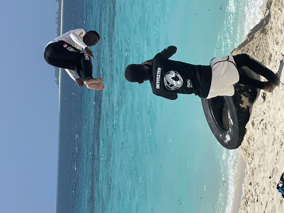 The scene depicts an outdoor athletic event on a sandy beach in Zanzibar, Tanzania. A male individual is suspended in mid-air, performing an acrobatic backflip above the shallow, clear turquoise ocean water. He is in a tucked, inverted position, wearing a white long-sleeved shirt and black athletic pants. His bare feet are visible. On the white sandy beach in the foreground, another male individual, viewed from the back, is crouched and holding a dark object, likely a smartphone, with both hands, aiming it upwards towards the airborne subject. This individual wears a black long-sleeved shirt with a white "SPARTAN" logo on the back, white athletic shorts, and black compression leggings; his feet are bare. To the left of the crouching individual, a large, dark vehicle tire is partially embedded in the sand. The background features the vast expanse of the Indian Ocean, transitioning from light turquoise near the shore to a deeper blue further out, with a faint landmass visible on the distant horizon under a clear, light blue sky.