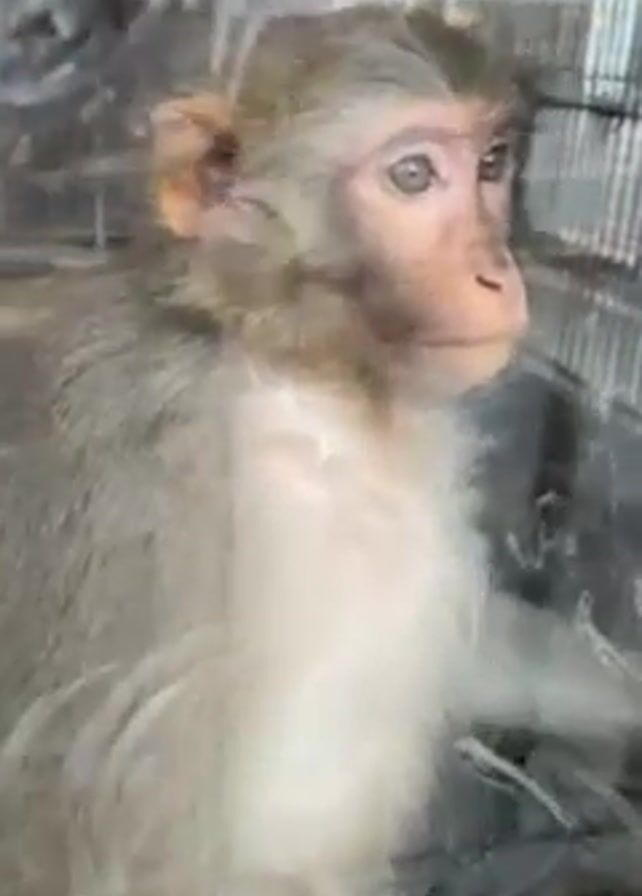 young monkey behind a clear partition. It is light-colored with a white chest and face. The monkey looks directly at the camera with large, expressive eyes. There is some unclear material visible behind the monkey, as well as part of a metal cage. The light is diffused, and the scene is somewhat grainy.