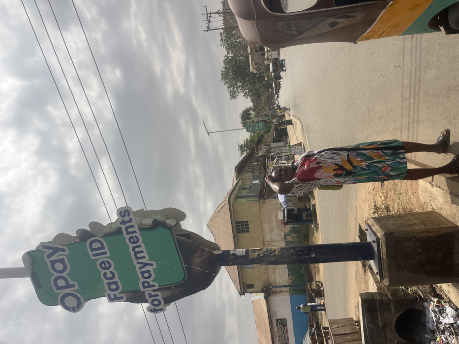 This image depicts a street scene in Jos, Nigeria, under an overcast sky. In the foreground, a dark utility pole rises from a concrete base. Attached to the pole is a bi-directional advertisement sign featuring a green smartphone held by a dark hand, displaying the text "Opay Face ID for Payments" in white and blue lettering. To the immediate left of the pole, an open concrete drainage culvert contains visible litter, primarily white plastic bags and other refuse. Standing slightly to the right of the pole is an adult individual with dark skin, facing generally towards the viewer. They wear a loose-fitting, knee-length dress or tunic patterned with abstract shapes and colors including white, red, black, green, and yellow. Their right hand is raised to the back of their head. They are wearing dark, open-toed sandals, and a light-colored bag is visible on their left shoulder. The midground features an asphalt road extending into the distance, curving slightly to the right. A three-wheeled auto-rickshaw, colored orange and green, is partially visible on the far right edge of the frame. Along the left side of the road, several buildings are visible; one is a single-story structure with a blue lower wall and a brown roof, while further back is a two-story building with light-colored walls, a brown roof, and a blue balcony railing. Further down the street on the right, additional Opay signage for "Mobile Banking" and a "POS" sign are visible on the sidewalk. Numerous vehicles, including cars and motorcycles, are present on the road in the distance, alongside pedestrians on the sidewalk. The background shows more buildings and sparse tree foliage lining the street. Four parallel dark utility lines traverse the upper portion of the image against a uniformly grey, cloudy sky.