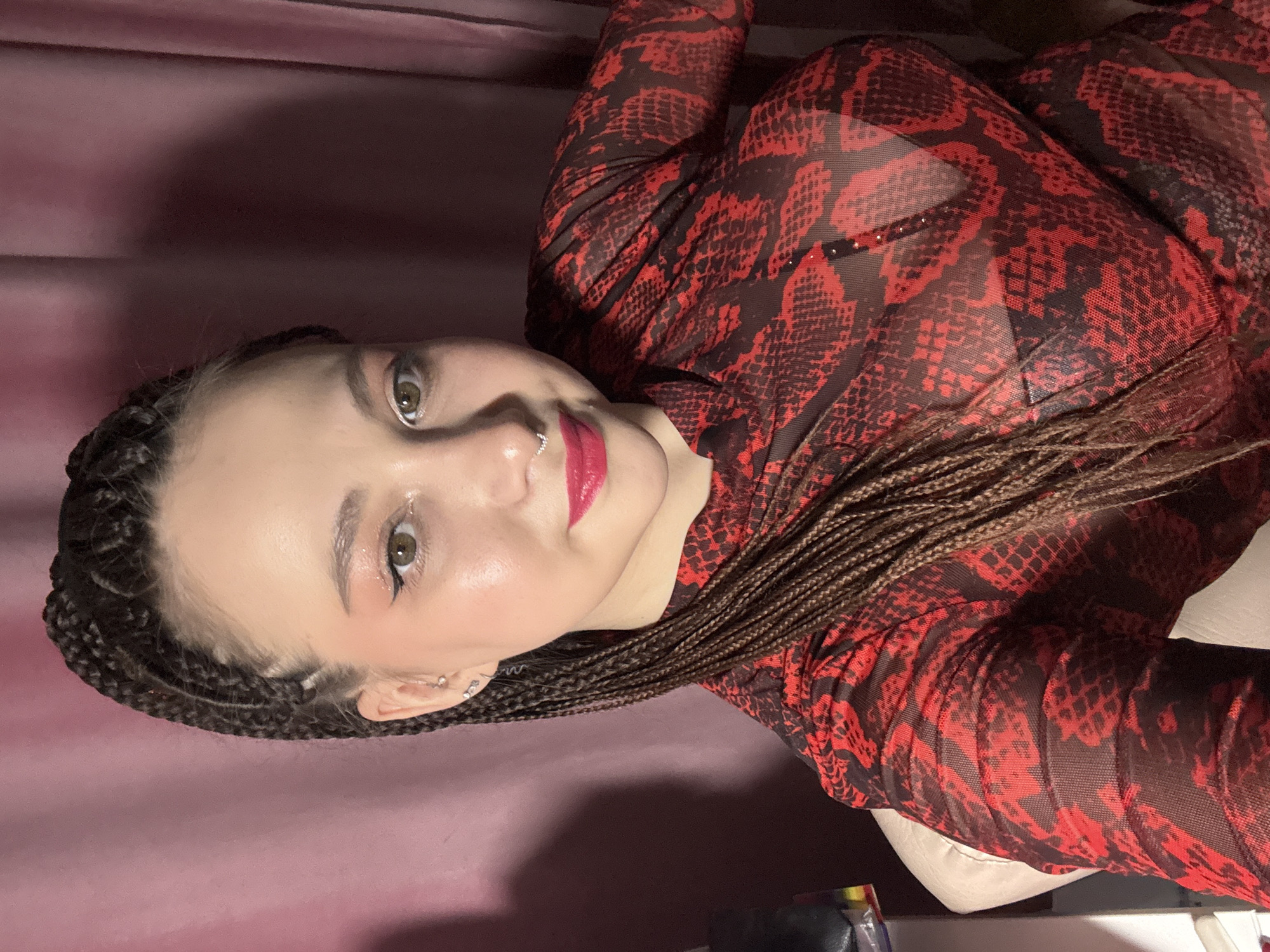 A person with braided hair and red lipstick is posing for a selfie. She has a nose ring and earrings and is wearing a red snakeskin-patterned top. The background appears to be a solid color. The location is unknown and cannot be determined based on the image.