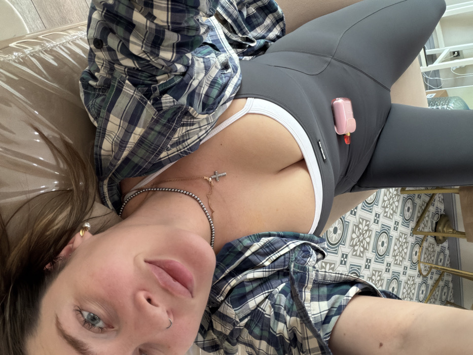 The image displays a female subject positioned supine, with the camera directed from overhead. She lies on a light-colored surface partially covered by a reflective clear plastic sheet. The subject wears dark grey athletic leggings and a white sports bra, with an unbuttoned blue and white plaid shirt draped over her torso. Two necklaces are visible: a thin chain with an inverted cross pendant and a darker beaded necklace. A small, pink disposable vape device with a red-orange tip rests on the dark grey fabric near her abdomen. Her head is turned slightly, revealing blue eyes, a small nose piercing in the left nostril, and a gold-colored earring in the right ear. The background features a patterned tile floor with geometric designs in shades of blue, grey, and off-white, along with the gold-colored legs of furniture and indistinct objects, indicating an indoor setting in Dolgoprudny, Russia.