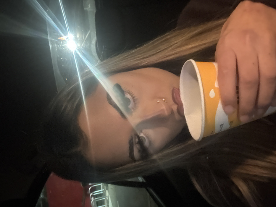 A young woman with long, highlighted hair is shown in profile, holding a paper cup with yellow and white markings. The cup is near her mouth, suggesting she might be drinking from it. She has pierced nostrils and striking eye makeup. The setting appears to be inside a car, with an intense light source visible through the windshield, creating a strong glare. The overall image is somewhat dark, with the focus on the woman and the cup.