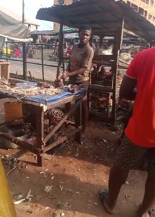 The video depicts a street-side chicken processing scene. A person stands behind a table with bird remains, seemingly preparing chicken for sale. A second person, wearing a red shirt, stands nearby. The area is littered with feathers and other debris. A metal cage behind the table houses live chickens. The scene is outdoors, with a building visible in the background.