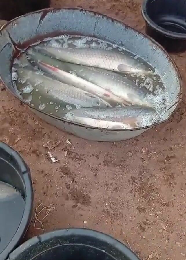 The camera scans over multiple buckets and basins of water, each containing one or more fish. The containers are on a surface of reddish-brown dirt. The fish are silver in color. A person wearing sandals is visible, walking around the containers.