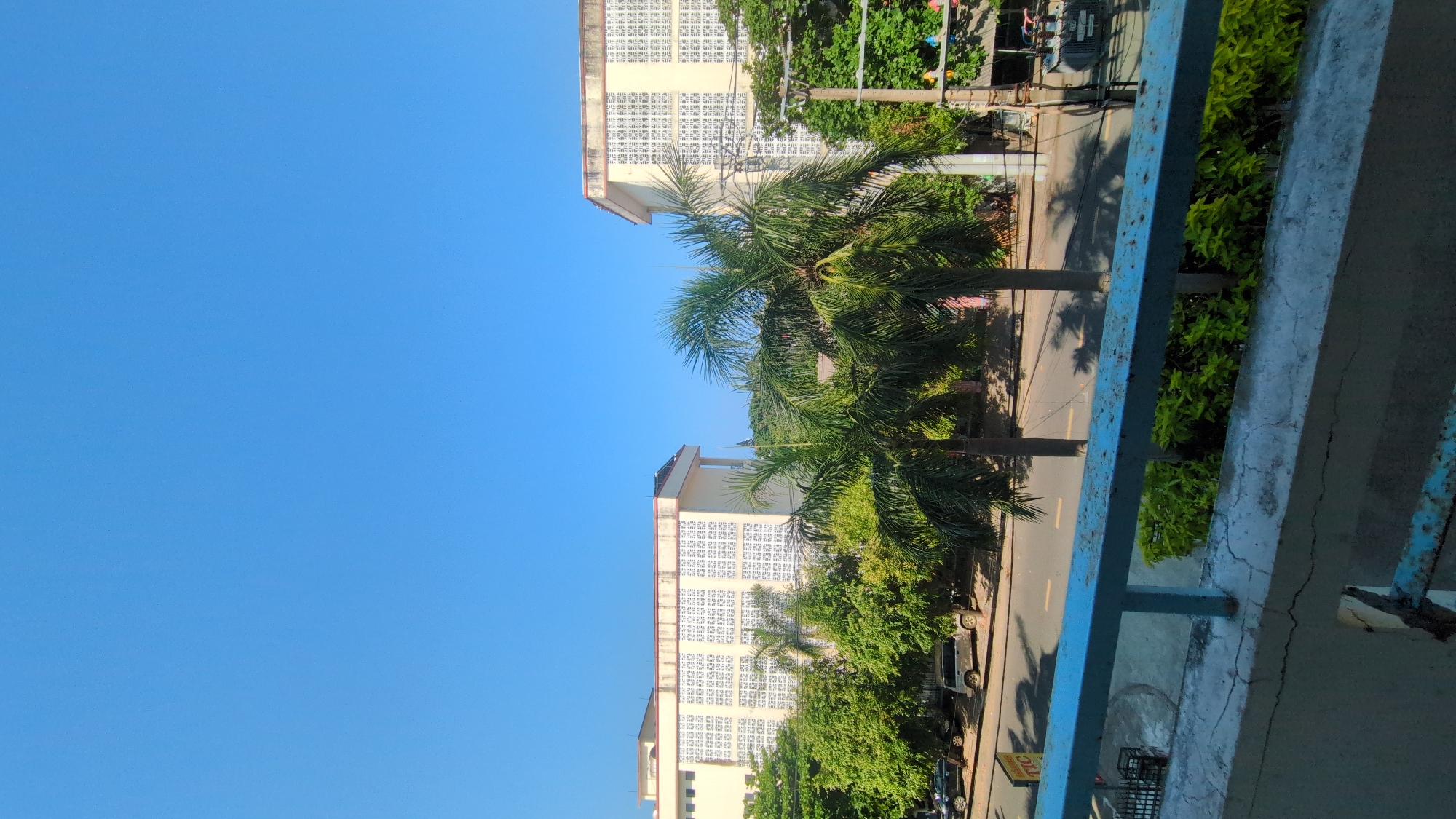 From an elevated vantage point, the photograph captures a scene in Tuy Hòa, Vietnam. The sky is cloudless and blue. Two light-colored buildings with similar architectural features stand on opposite sides of a street. The buildings appear to be multi-story, featuring repetitive window designs. A row of palm trees and other greenery lines the street, casting shadows on the pavement. A blue-painted railing is in the foreground, providing a sense of depth to the scene. Some vehicles are parked along the street, and there are signs visible, giving hints of the city's urban setting. The composition is vertical, with the sky taking up a significant portion of the frame.