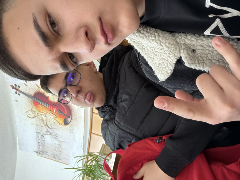 Two young males are depicted in an indoor setting, likely a classroom or common area within an educational institution in Panagyurishte, Bulgaria. The subject in the foreground on the right, partially visible from the chest up, has short dark hair and dark eyes. He wears a dark top and a dark jacket with a cream-colored fleece lining. His left hand, positioned in the lower right, displays an extended index and pinky finger, forming a "rock on" gesture; visible skin around the base of the extended index finger appears dry or irritated. His facial expression is neutral with slightly pursed lips. The second subject, positioned behind and to the left, wears eyeglasses with dark frames and a black puffer jacket. He has short dark hair and is looking at the camera with his tongue extended in a playful gesture. A red backpack is visible on his left side. The background features a light-colored wall or whiteboard with a large poster depicting a brown violin surrounded by musical notes. Below the poster, wooden paneling is visible. A green potted plant is partially visible in the far left background.