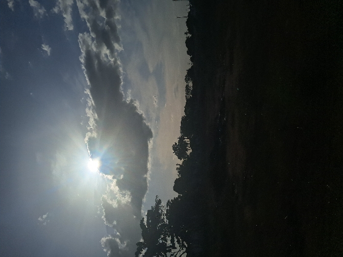 A bright sun shines amidst a cloudy sky, partially obscured by a dark, elongated cloud formation. Below, a dark, silhouetted treeline sits atop a field or obscured landscape. The contrast between the intense sunlight and the dark foreground creates a stark visual divide. The image is oriented vertically.