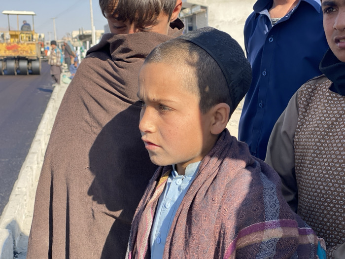 The image captures a roadside scene in Gundigan Village, Afghanistan, under direct daylight. In the foreground, a young boy, approximately 6-10 years old, is the central figure, looking slightly to the right with a neutral expression. He wears a dark cap, a light blue long-sleeved garment, and a patterned purplish-brown shawl draped over his shoulders. Sunlight illuminates his left side. Partially visible behind him to the left is another male figure obscured by a brown wrap. To his right, two other males are partially visible; one in a dark blue collared shirt, and another further right in a patterned brown vest over a dark garment. Beyond a light-colored concrete barrier in the midground, a yellow road roller (compactor) with an operator is visible on a dark, recently laid road surface, indicating ongoing road construction. Several other individuals are scattered along the roadside in the background, observing the activity or walking. Distant, low-rise buildings line the horizon under a clear, bright blue sky, suggesting a village or developing urban environment.