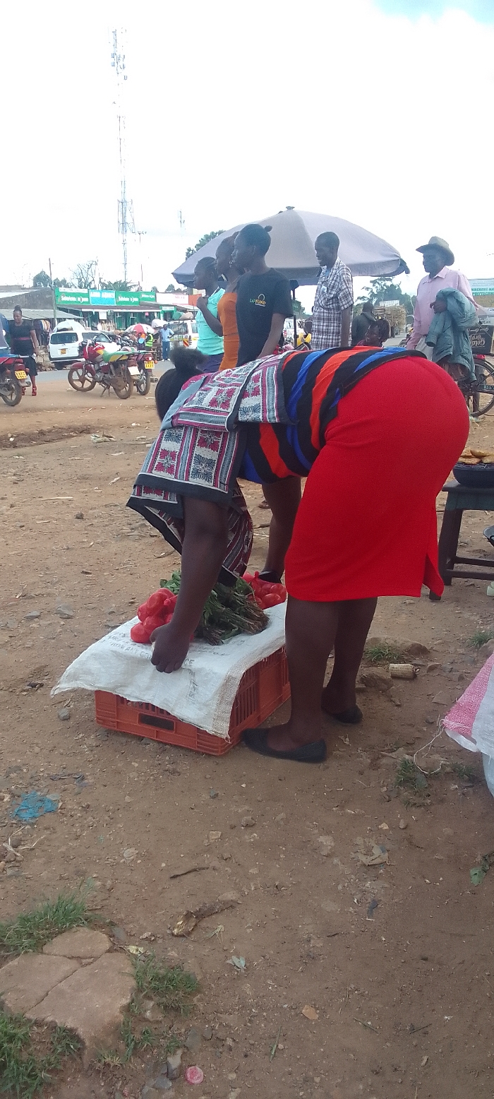 A woman is arranging red tomatoes and green leafy vegetables in a plastic crate covered with a white cloth. She is wearing a blue, red, and white striped shirt over a black and white patterned shirt, and a red skirt. Her black hair is pulled back into a ponytail. She is standing on a dirt path in Kakunga, Kenya, near the coordinates 0.376 latitude, 34.853 longitude. There are several other people in the background, and a few motorcycles are parked nearby. The sky is cloudy.