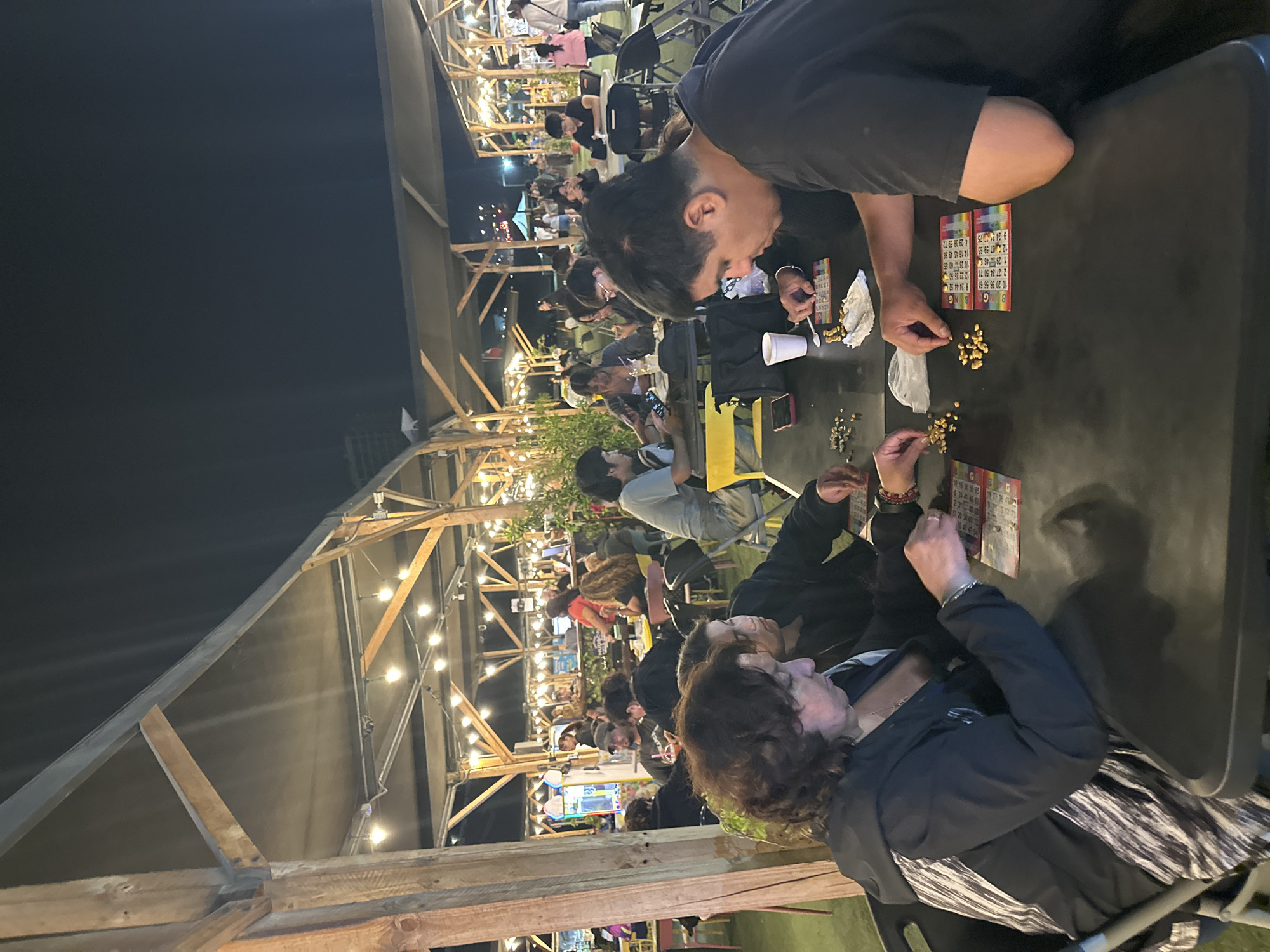 Here's a description of the image: **Scene:** An outdoor nighttime gathering with people sitting at tables, playing bingo