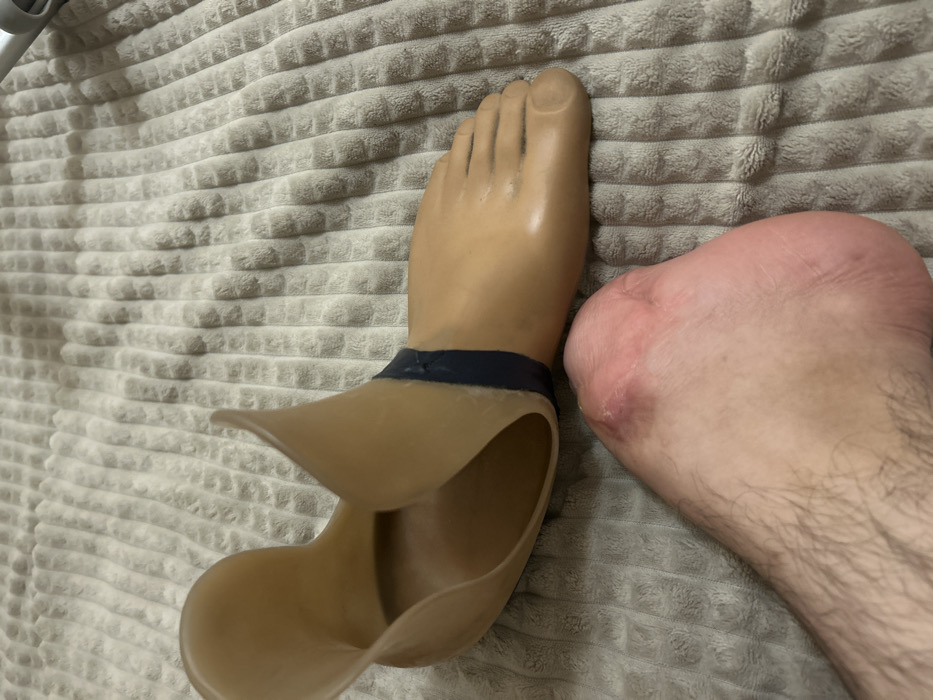 - "The scene, observed to be in Yerevan, Armenia, displays a human lower limb amputation stump positioned alongside a prosthetic foot assembly" by FM-O8TWD3, licensed under CC BY 4.0