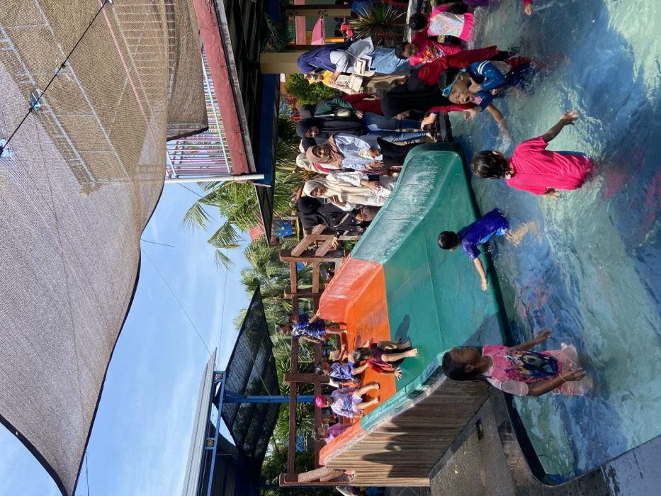 A group of children enjoy a water slide at a water park. Several children are on the slide, while others are in the water. Several adults, some wearing hijabs, observe the scene from the side. The water park is open air, with palm trees visible in the background. Shade structures provide cover from the sun.