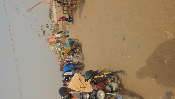 This image depicts a bustling unpaved street in Ado, Nigeria, under a hazy, light grey sky