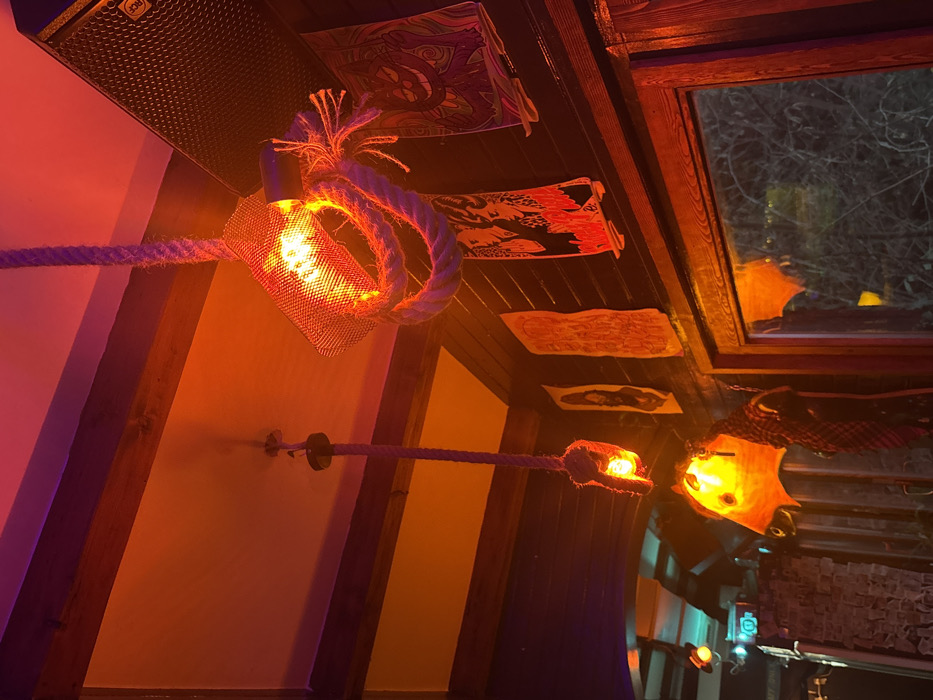 The image depicts the interior of a dimly lit establishment in the City of Zagreb, Croatia, characterized by warm, intense orange-red lighting emanating from multiple fixtures. Exposed wooden beams cross a lighter-colored ceiling. In the foreground, a prominent ceiling-mounted light fixture hangs from a thick, light-colored rope. The light source is an exposed bulb within a rectangular metal mesh cage, further adorned with wrapped rope, emitting a strong orange-red glow. To its left, another light fixture, suspended by a thinner rope, features an exposed bulb also emitting an orange-red light. Further in the background on the left, additional light sources emit cooler, blue-green light. The dark-paneled walls display various decorations. In the upper right, a black RCF brand speaker is mounted. Below it, a vibrant, psychedelic artwork featuring a grinning, stylized cat face in purple, green, and orange is visible. To its left, a decorated skateboard deck with red and black graphics hangs, alongside several other framed or mounted art pieces, including a portrait of a bearded individual. Below the mid-ground light, a decorative, internally illuminated horse head, made of a light-colored material and draped with a patterned scarf, is mounted. A dark wooden-framed window in the lower right portion of the image reveals an exterior scene of dark, indistinct tree branches, suggesting nighttime conditions outside. No individuals are visible in the scene.