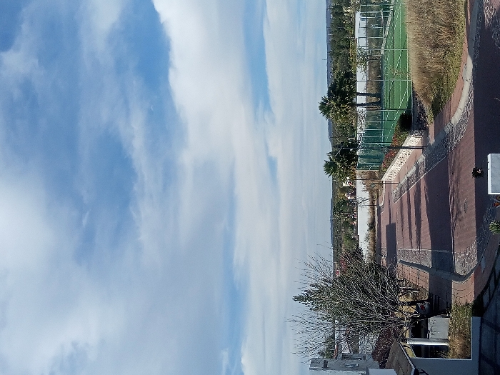 A landscape view under a blue sky with patchy white clouds. A road with brick-like pavers runs along the right side, adjacent to a grassy area and a tennis court with green turf. Palm trees dot the scene. In the lower right, part of a building is visible, with a tree nearby. The scene appears to be taken from a slightly elevated viewpoint.