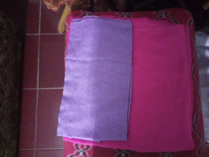 The image displays an indoor scene, likely within the city of Bamhori, India. In the foreground, two pieces of fabric are neatly arranged on a patterned surface. A rectangular piece of solid bright pink fabric occupies the right half of the frame. Overlapping its left edge is a narrower, rectangular piece of solid light purple fabric, exhibiting a fine speckled texture. These fabrics rest on a dark red surface adorned with a repeating pattern of stylized motifs in lighter colors and black, possibly a cushion or another textile. To the left of the fabrics, a portion of a tiled floor is visible. The floor consists of dark reddish-brown square tiles separated by light-colored grout lines, forming a grid. No individuals are present in the frame, and no specific actions or interactions are depicted. The lighting is moderate, and the image exhibits some visual noise or grain.