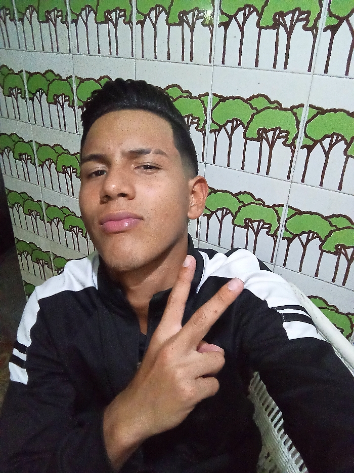 A young adult male with medium brown skin, dark hair with a fade, and a small cut on his left eyebrow (viewer's left) is depicted in a medium-close portrait. He is wearing a black long-sleeved jacket with white shoulder panels featuring three black stripes. His right hand is raised, forming a V-sign with his index and middle fingers. He looks directly at the camera with slightly pursed lips. The background consists of a tiled wall with a repeating pattern of stylized green-canopied trees. A portion of a white, possibly wicker or plastic, chair is visible on the right. The location in the city of Unknown, Unknown is an indoor setting.