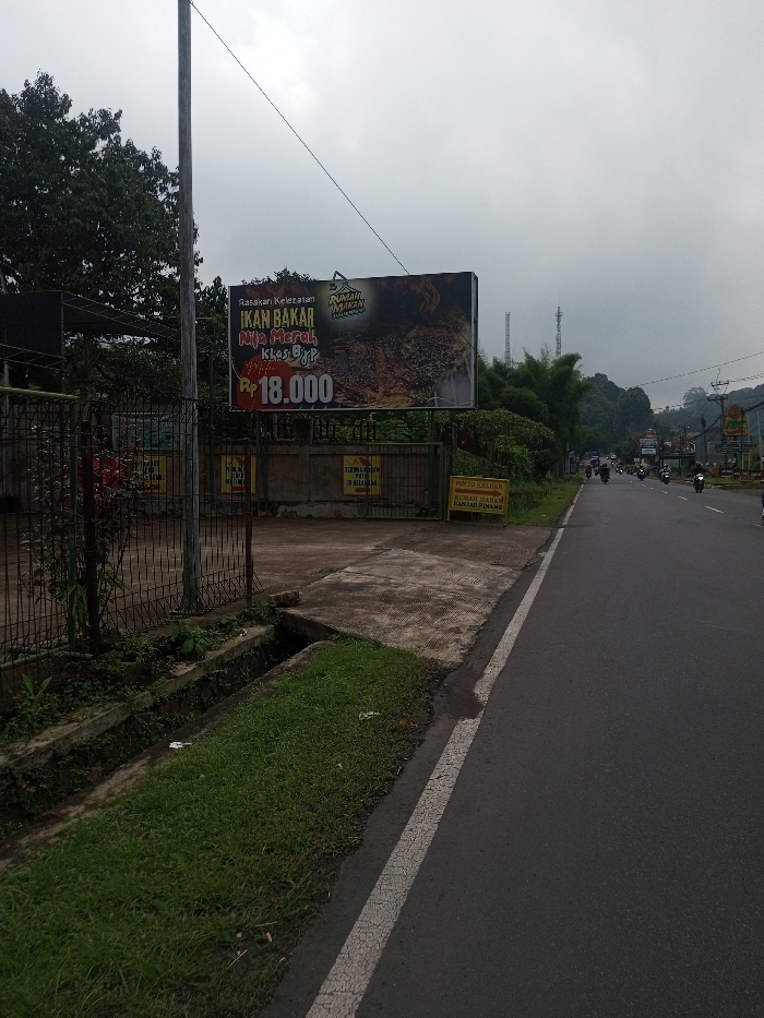 This image captures a roadside scene, identified as being in Sandamal Eliya, Sri Lanka, under an overcast sky. A two-lane asphalt road with a solid white edge line occupies the right foreground and midground. Parallel to the road, a narrow grassy verge leads to a concrete drainage ditch, beyond which a dark metal fence delineates a property boundary. Behind this fence, a prominent rectangular billboard advertises "IKAN BAKAR NILA MERAH" (Grilled Red Tilapia) for "Rp 18.000" (Indonesian Rupiah) and features the "RUMAH MAKAN" (Restaurant) logo. Several smaller yellow signs, displaying text primarily in Bahasa Indonesia, are also visible behind the fence. A tall, dark utility pole stands on the left. In the midground, multiple individuals on motorcycles are traveling away from the viewer on the road. The background consists of dense green foliage, undulating hills, and two slender communication towers. No pedestrians are visible.