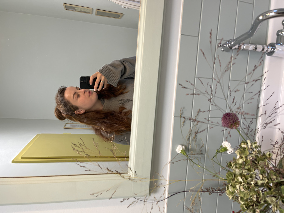 An indoor scene depicts a mirror selfie taken in what appears to be a washroom or bathroom in Kaiserslautern, Germany. The primary subject is a female individual reflected in a rectangular mirror with a light-colored frame. She has long, wavy reddish-brown hair, partially gathered in a top bun, and is wearing a distressed grey knit sweater. She holds a black smartphone with her right hand, capturing the image, and a silver ring is visible on her left ring finger. Her gaze is directed towards the phone screen. In the reflected background, a light blue-grey wall is visible. To the left, a portion of a pale yellow door or panel is reflected. To the right, two small framed items are mounted vertically on the wall. Below the mirror's reflection, a section of light blue-grey subway tiles is present. In the foreground, a floral arrangement partially obscures the bottom left of the mirror and the view of the sink area. This arrangement consists of dried-looking green and beige hydrangea-like clusters, two white carnation-like flowers, one spherical purple flower (likely an allium), and numerous stalks of dried grasses with small seed heads. To the right, a white porcelain sink basin is partially visible, along with a polished chrome faucet featuring a lever handle. The overall lighting is soft and even.