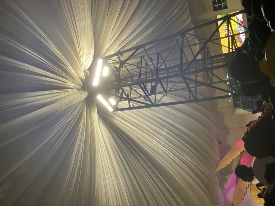 A high-angle shot captures a ceiling adorned with flowing white fabric, gathered at the center around bright lights. A metal structure supporting the lighting system is visible. To the right, decorative elements with wings and balloons partially frame the scene. A stained-glass window is seen through the metal beams, adding a touch of color to the overhead view.