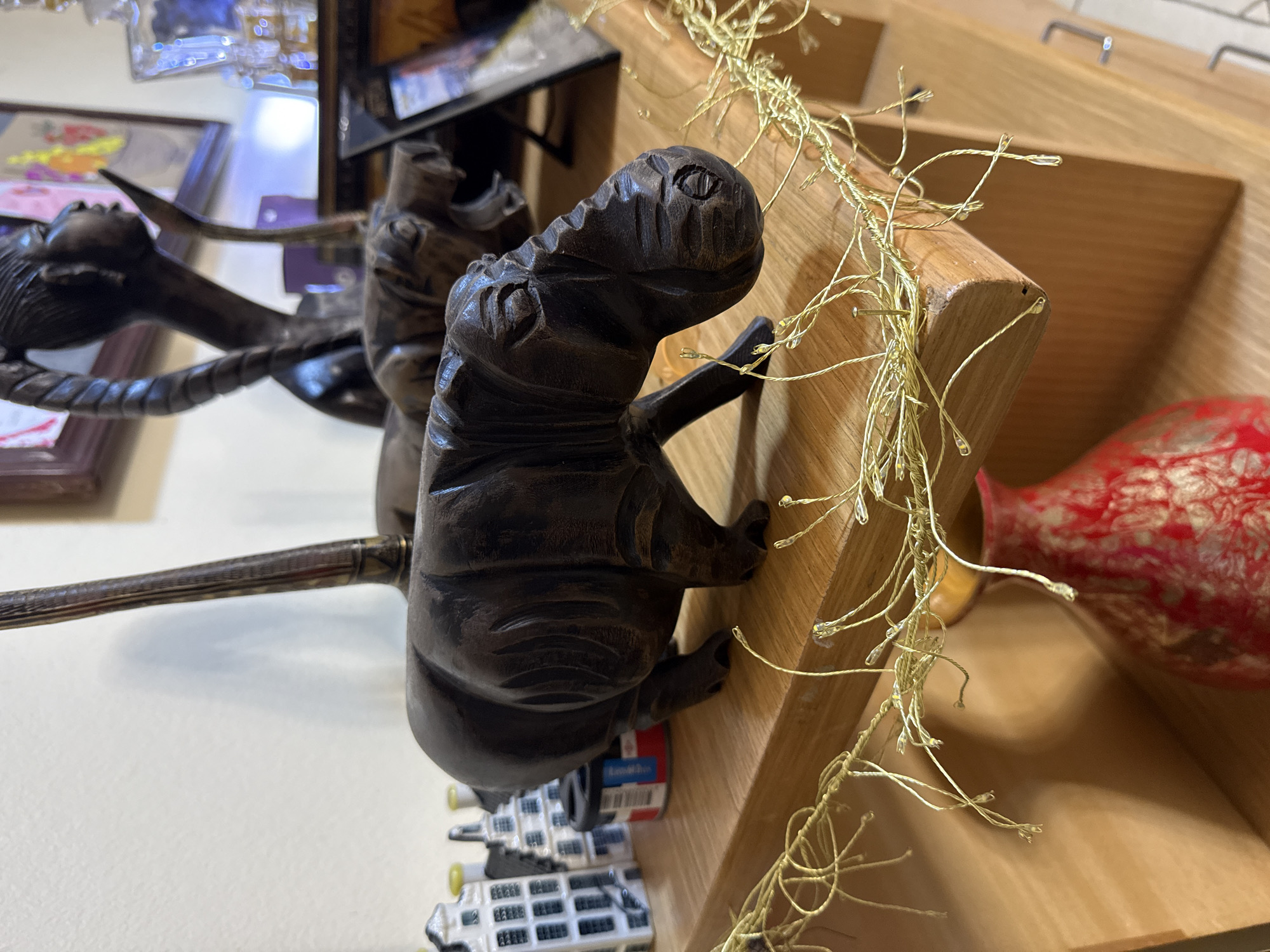 The scene is an interior display of decorative objects on a light-colored wooden shelf in Alaguntan, Nigeria. In the foreground, a dark brown, carved wooden figurine of a hippopotamus is positioned centrally, facing right. Its rough, dark texture shows carved details on its body and face, including visible nostrils. Draped across the front edge of the wooden shelf, below the hippopotamus, is a string of decorative lights composed of thin gold-colored wires and small, clear, tear-drop shaped beads. A small silver pin secures the lights on the left side of the shelf. To the left of the hippopotamus, on the same shelf, are two miniature white ceramic buildings with dark roofs and yellow accents, resembling Amsterdam canal houses. A small black cylindrical container with red and blue labels is situated behind these miniature buildings. Behind the hippopotamus, partially obscured, is another dark wooden carving, possibly an animal head. Further back and to the right, a dark carved wooden bust of an individual with braided hair and an elongated neck is visible, with an antler or horn-like element extending upwards. A framed picture or photograph in a dark frame is visible standing on the shelf to the right of the bust. In the upper right background, a clear, faceted glass decanter is visible. Below the wooden shelf, on a lower shelf or surface, a red vase with intricate gold or white floral patterns is partially visible on the left. The background consists of a plain, light-colored wall, with a framed picture featuring colorful artwork visible on the wall behind the carved bust. The overall lighting suggests an indoor setting, with no direct sunlight. No individuals are present in the image.