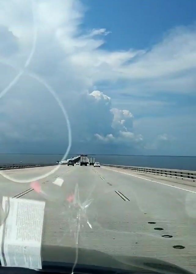 The view from inside a car driving along a bridge is captured. The road is straight, and a few other vehicles are visible ahead. The sky is partly cloudy, with the ocean visible on both sides of the bridge. A document, sunglasses, and a small decorative item are on the dashboard.