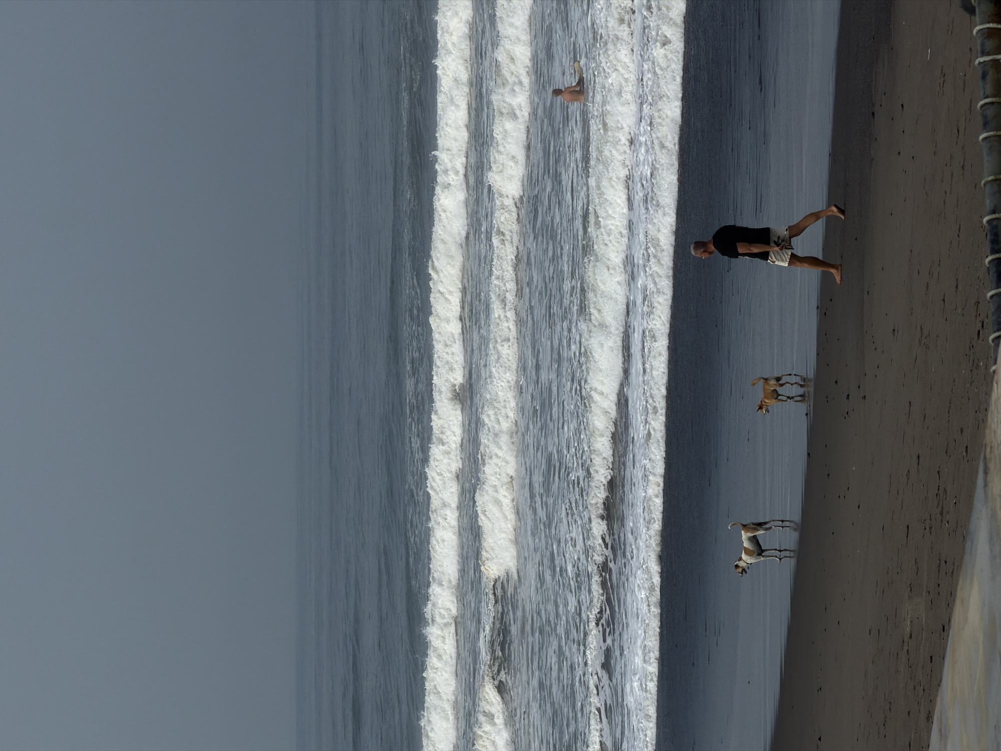 The image depicts a dark sand beach in Belalang, Indonesia, under an overcast grey sky that meets the distant ocean horizon. In the foreground, a barefoot male, with short light-colored hair, wearing a black t-shirt and light shorts, walks from left to right across the wet sand. Two dogs are present on the beach near the water's edge: a larger, white and brown dog stands facing right, while a smaller, tan dog stands to its right, also facing right. In the midground, the ocean displays multiple lines of white-capped breaking waves. An individual, shirtless and partially submerged in the water, is visible holding a light-colored board. A low, horizontal concrete-like structure is partially visible at the very bottom edge of the frame.