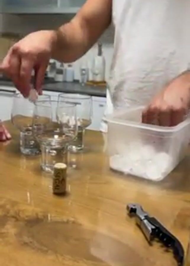 A person puts ice into wine glasses. Four wine glasses sit on a wooden table next to a container of ice. A cork, and a corkscrew rest on the table as well. The person puts a piece of ice into each wine glass. There is a kitchen in the background.