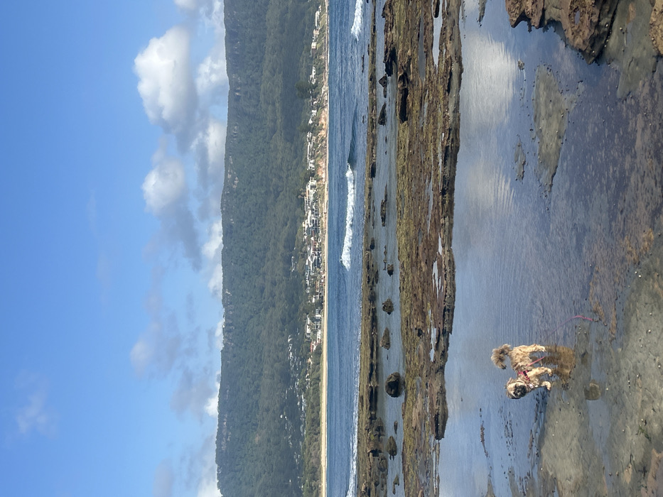 A landscape view of a beach scene. A dog stands on rocky land near shallow water. A mountain range covered in lush greenery is visible behind a sandy beach and blue ocean. White clouds dot the clear blue sky. The scene is bathed in bright daylight, creating a serene and scenic atmosphere.