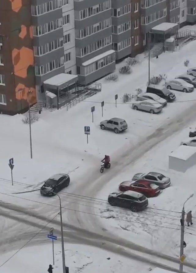 snowy urban street scene, taken from a high angle. Several multi-story apartment buildings surround the area. Cars are parked along the streets, partially covered in snow. A person on a small motorcycle, wearing a red delivery backpack, is navigating the snow-covered roads. Pedestrians are visible walking on the sidewalks and crossing the streets. The weather appears overcast and snowy.