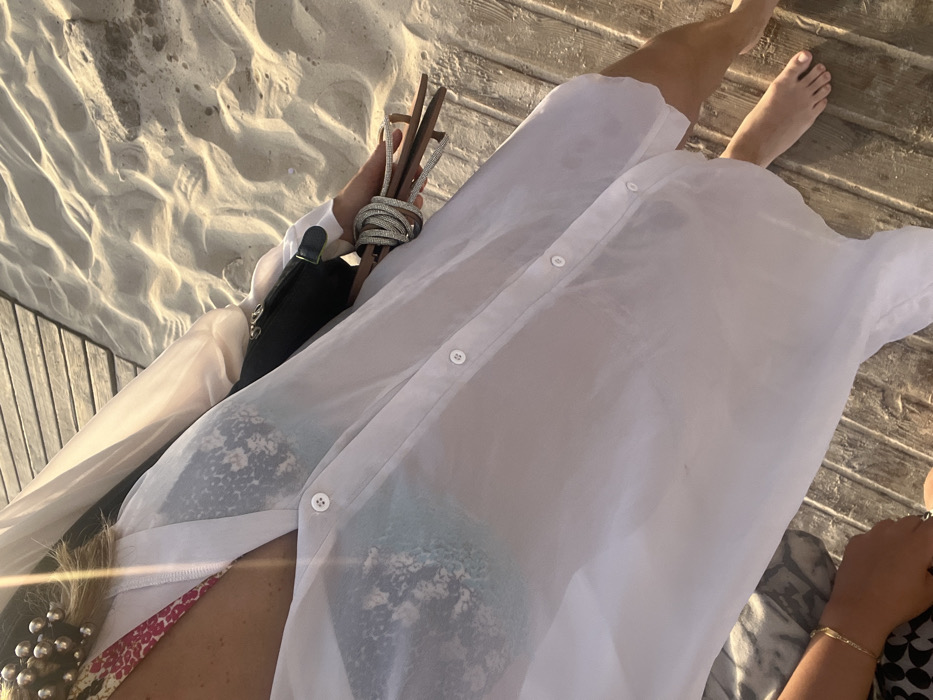 A woman in a white, sheer button-down shirt poses with legs visible against a wooden surface, possibly a deck. White sand is visible in the background. She carries a black purse and a pair of strappy, heeled sandals. Her swimwear is visible under the shirt. A hand wearing a delicate gold bracelet is visible.