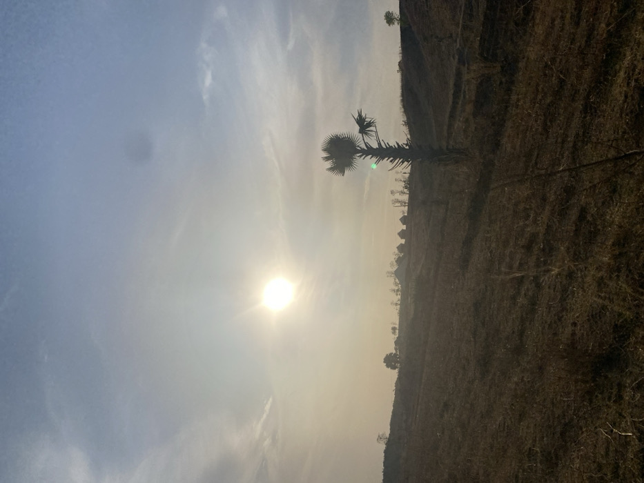A sun-drenched landscape features a tall, slender palm tree silhouetted against a hazy sky. The land is dry and appears barren, with sparse vegetation and uneven terrain. The sun dominates the scene, its bright light washing over everything, obscuring details and casting long, soft shadows. The sky is a blend of pale blue and yellow, suggesting either sunrise or sunset in a warm climate.