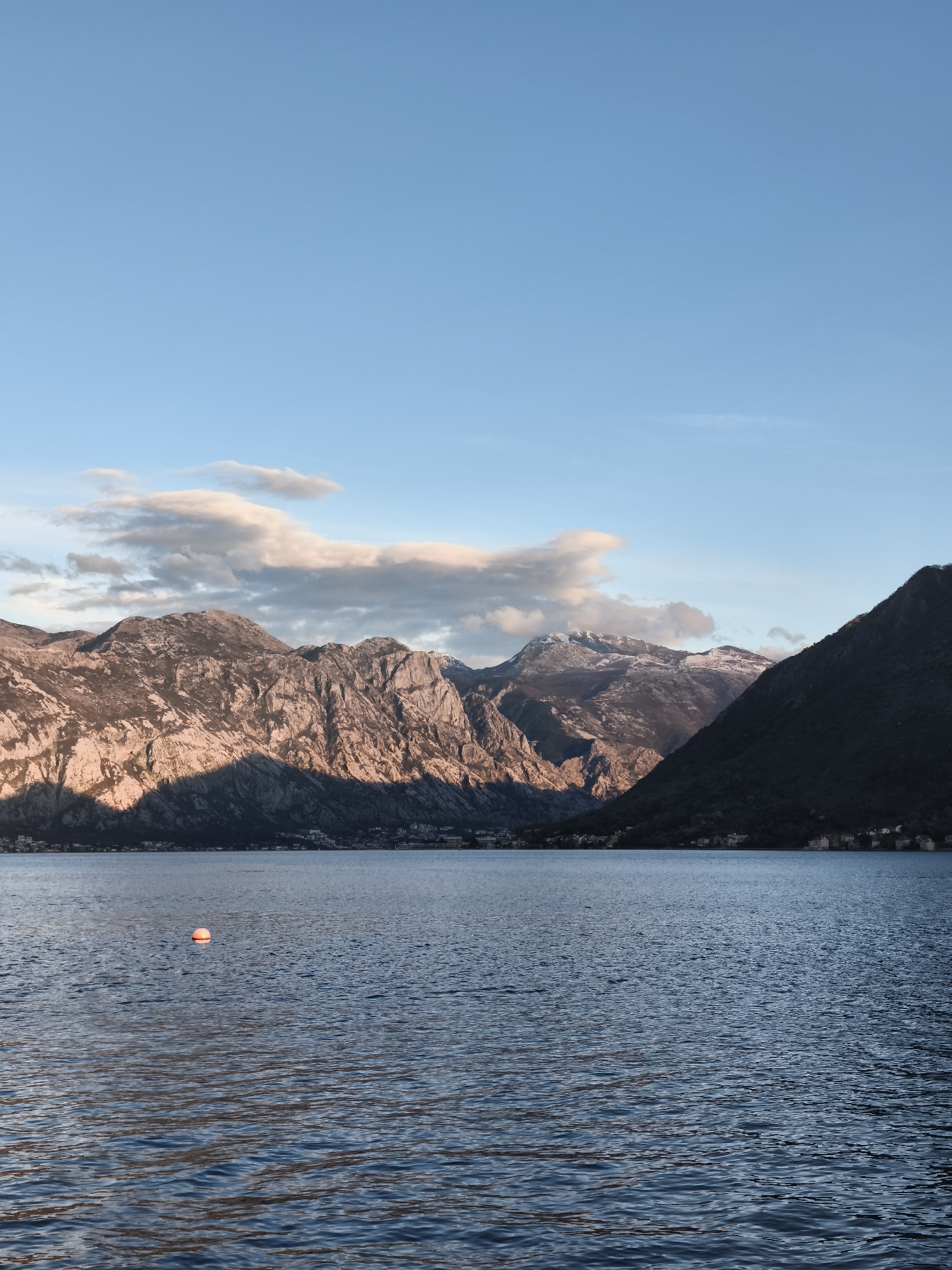 The image depicts a scene in Perast, Montenegro, showcasing a body of water with mountains in the background under a partially cloudy sky. The water has visible ripples, suggesting a gentle breeze. An orange and white buoy is floating in the water near the foreground. The mountains in the background are rugged with visible rock formations. The left and center mountains are illuminated by sunlight, while the mountain to the right is shadowed and covered with dark trees. The sky is a gradient of blue with some white clouds. Some houses can be seen between the mountains and the water.