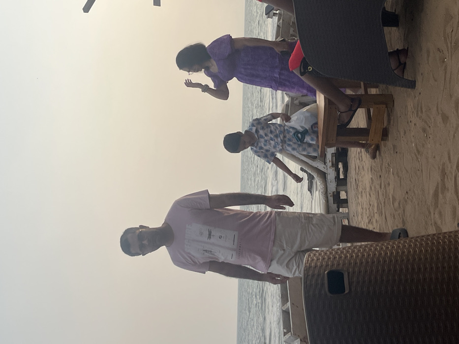 A family is gathered on a beach. A man in a pink shirt and khaki shorts stands in the foreground. Behind him, a boy in a blue patterned shirt reaches forward. A woman in a purple dress looks down at her hand. They are near the edge of the water, and some are standing on a wooden platform. A dark chair is in the lower right corner. The overall scene appears to be slightly tilted.