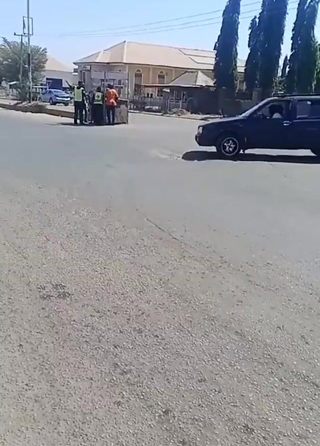 street scene with a yellow auto-rickshaw parked on the side of the road. The rickshaw has a black canopy and the door on the side facing the camera is open. A black vehicle is driving past on the street. In the background, there are several people standing around what appears to be a checkpoint or a barricade. Some of the people are wearing reflective vests. There are buildings and trees in the background, and the sky is clear. The road is paved and appears to be in good condition. The camera is handheld and stable.