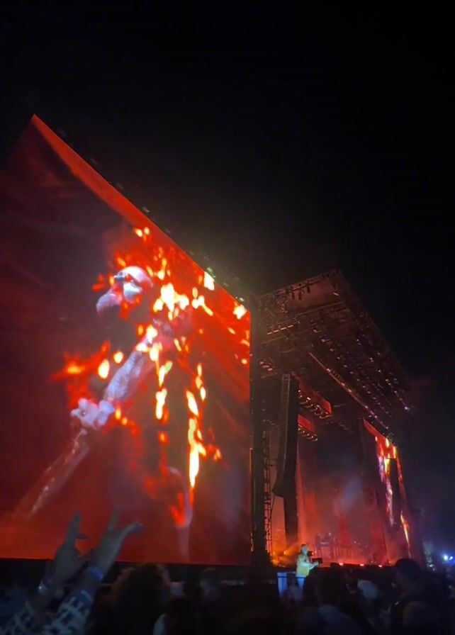 live music performance at night. A large screen displays fiery, swirling imagery. A band is performing on stage, their figures partially visible against the lights. The crowd is large and silhouetted, with some hands raised. The stage is complex with scaffolding and lighting rigs. The sky is dark.