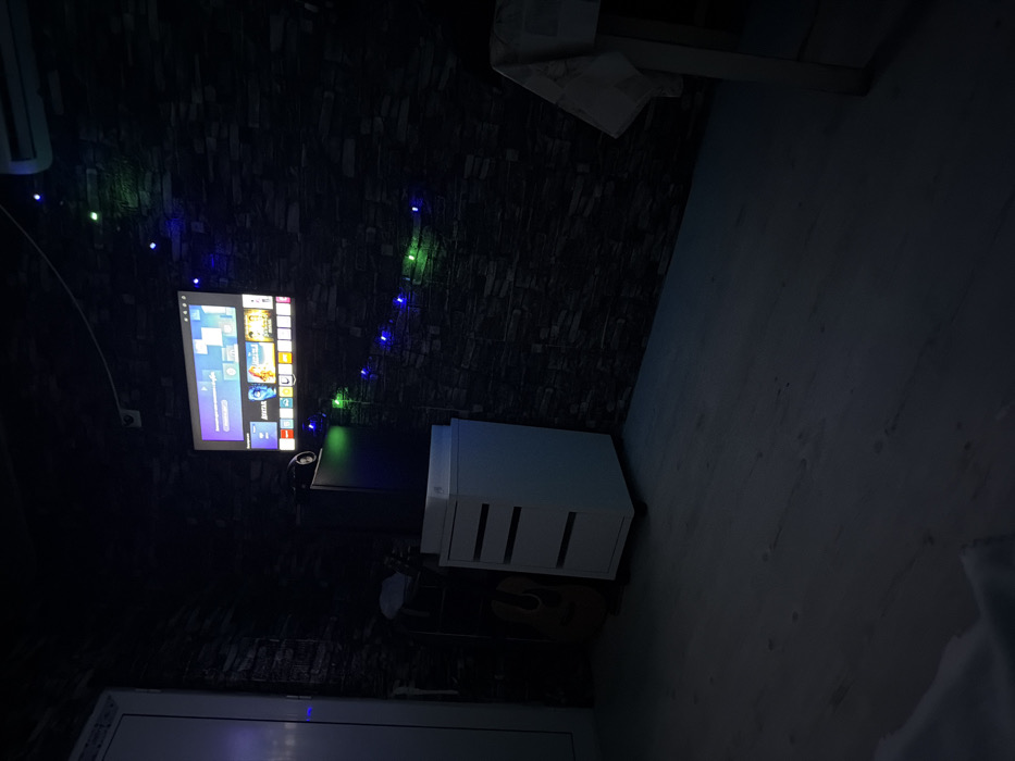 The scene depicts a dimly lit interior room in the city of Kermen, Bulgaria. The primary light sources are a wall-mounted smart television displaying a brightly lit interface with various application icons, and a string of blue and green LED lights strung horizontally across the stone-patterned feature wall. An air conditioning unit is mounted on the wall above the television. Below the television, a black rectangular object, possibly a speaker or subwoofer, rests on a white, four-drawer rolling storage unit. A light-colored acoustic guitar leans against the wall behind the storage unit. To the far left, a white door and door frame are partially visible. To the right, a table draped with a white, patterned tablecloth is present. The floor is light-colored wood laminate. No individuals are present, and no actions or interactions are depicted.