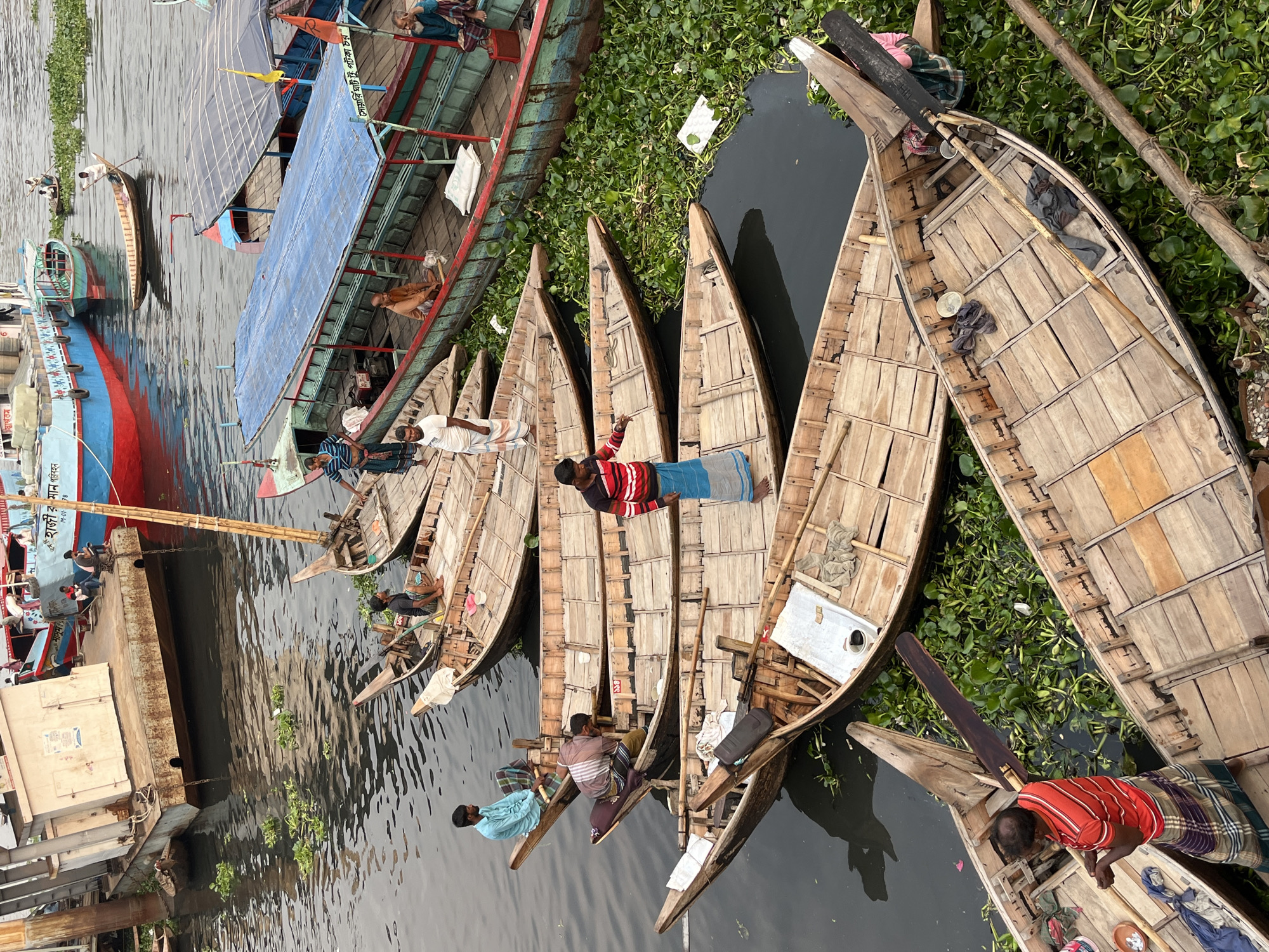 This image depicts a scene on the Buriganga River in Dhaka, Bangladesh. Several narrow wooden boats are lined up alongside larger, more colorful vessels and a concrete pier. People are visible in and around the boats, with some sitting or lying down in the smaller boats. The water is dark and filled with vegetation. The overall environment suggests a bustling river scene with various boats and people engaged in activities related to the river.