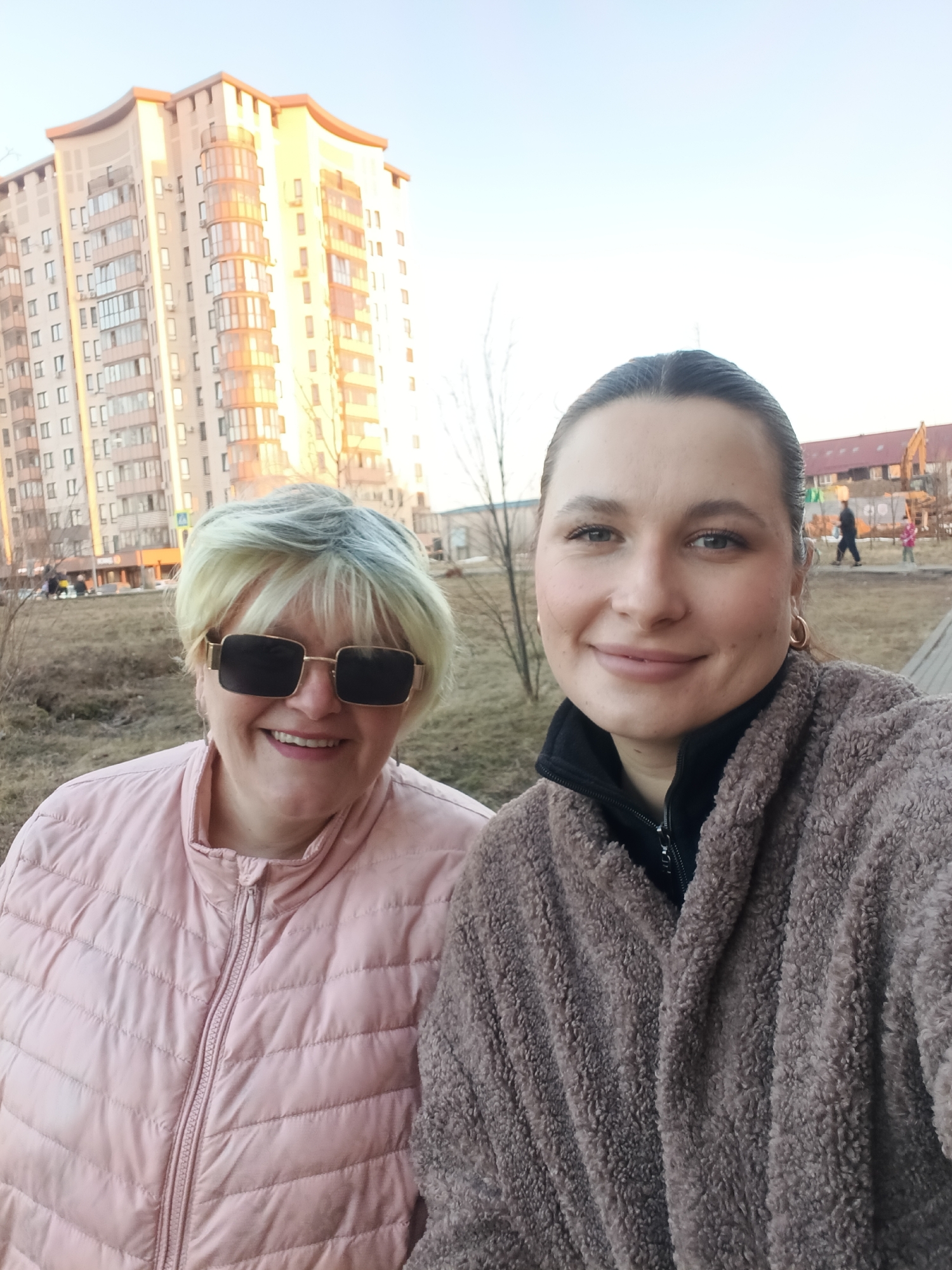 An outdoor daylight scene in Odintsovo, Russia, captures two adult females in a close-up photograph. The individual on the left, an older female, has short blonde hair with visible dark roots, wears rectangular gold-framed sunglasses, and is dressed in a light pink quilted puffer jacket, displaying a smile. To her right, a younger female with dark hair pulled back wears a black zippered top underneath a brown, textured fleece jacket, also smiling. In the mid-ground, a multi-story residential building with a distinctive curved facade, light-colored exterior, and numerous balconies is prominently featured, illuminated by warm, low-angle sunlight. This building is identified as part of the residential complex located at **Mozhayskoye Shosse 100, Odintsovo, Odintsovsky District, Moscow Oblast, Russia**. Further in the background, to the right, a low-rise building with a reddish roof and an excavator nearby suggests ongoing construction or renovation. The immediate environment consists of dry, sparse grass and bare trees, indicative of early spring or late autumn conditions. Several blurred figures, including pedestrians and a child, are visible in the distant background.