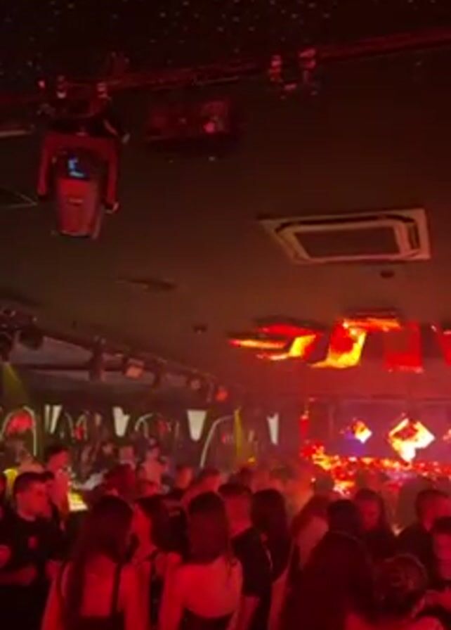 dimly lit nightclub with a crowded dance floor. Many people are standing and mingling, bathed in red and yellow lights. There are stage lights mounted on the ceiling, and some are moving, projecting beams of light. The ceiling itself is dark and adorned with small, scattered lights, resembling stars. There's an air conditioning unit visible, and the overall impression is one of a lively, social gathering in a nightlife setting.