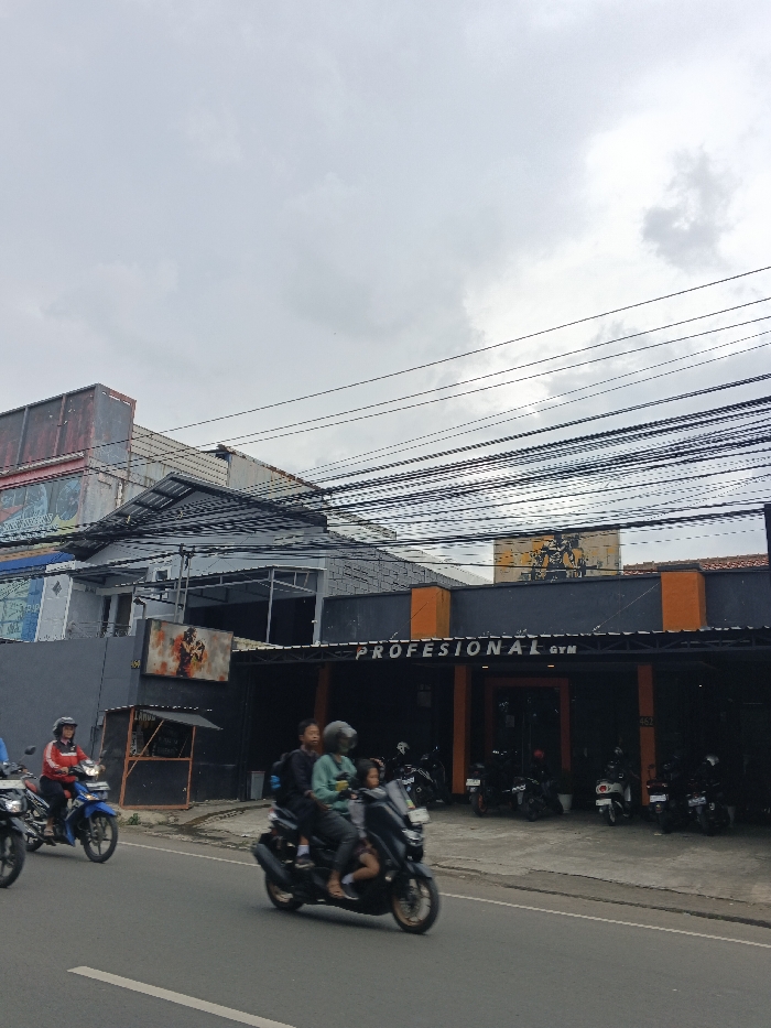 A street scene shows a gray, cloudy sky above buildings and numerous power lines. A "Profesional Gym" is visible, its entrance fronted by parked motorcycles. In the foreground, motorbikes are actively being driven on the street. One motorbike carries three people, including a child. The overall atmosphere suggests a bustling, ordinary day in an urban area.