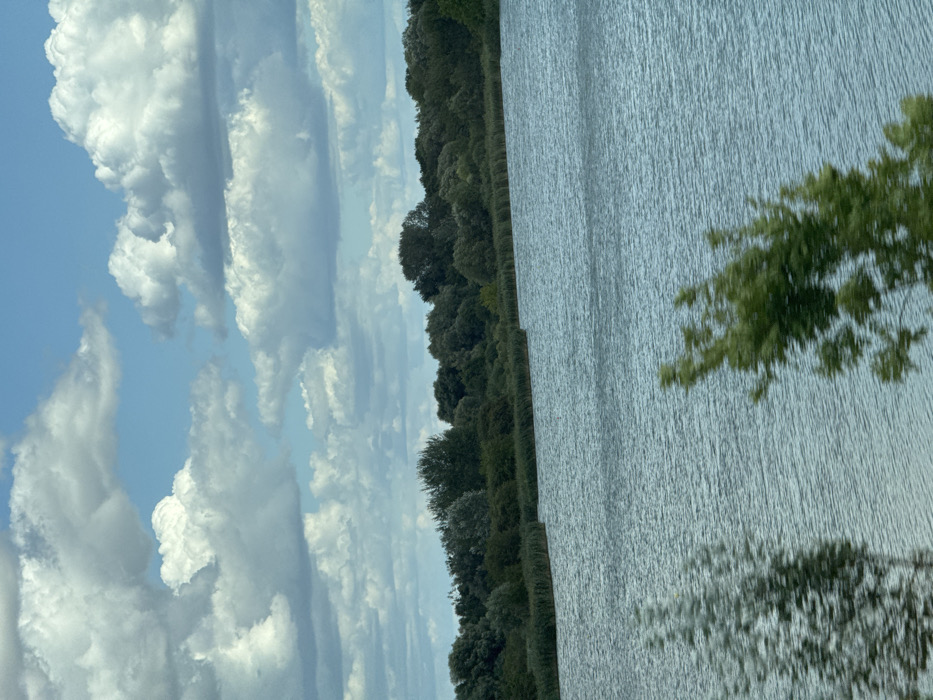 The image displays a natural outdoor scene featuring a large water body under a partially cloudy sky, consistent with the lake environments within Poznan, Poland. The upper half of the frame shows a bright blue sky populated by numerous white cumulus clouds of various sizes and densities. The midground is dominated by an expanse of light blue-grey water, the surface of which is rippled, indicating wind activity. The far bank of the water body is densely vegetated, beginning with a narrow, continuous band of tall green reeds or grasses at the waterline, transitioning into a thick line of green deciduous trees and bushes. These trees exhibit varying heights and foliage densities, forming a natural forest line. The immediate foreground, at the bottom of the frame, shows two blurred masses of green foliage, suggesting the image was captured from a moving vantage point. No human subjects or discernible man-made structures are present within the scene.