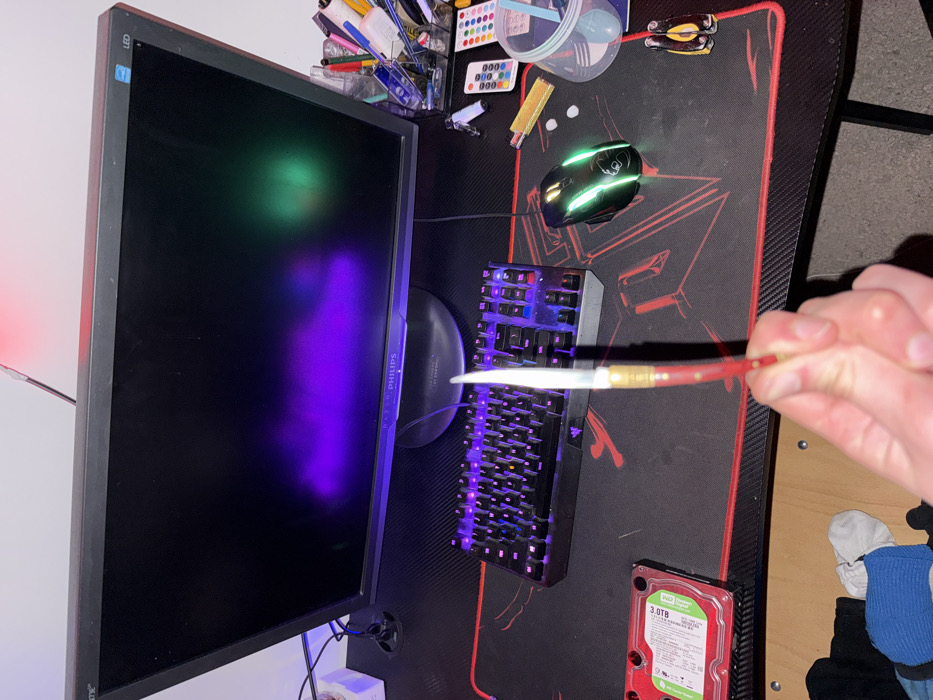 An indoor photograph, taken in Sofia, Bulgaria, provides a high-angle view of a desk setup. In the immediate foreground, a light-skinned hand, likely human, grasps a slender, sharp-tipped object with a red handle and gold-colored accents, resembling a small knife or stiletto. Below the hand, on a wooden floor surface, a pile of miscellaneous clothing items, including a blue ribbed garment and white socks, is visible. The main desk surface is covered by a dark mouse pad featuring a red border and a subtle carbon fiber-like texture with faint red graphic elements. From left to right on the desk, a red Western Digital 3TB external hard drive is present. Centrally, a black mechanical gaming keyboard with active purple RGB backlighting illuminates its keys. To its right, a black gaming mouse exhibits green RGB lighting. Further right, a clear plastic container holds various small items, including what appears to be a light blue plastic spoon or scoop. Adjacent to the container, a small white remote control with multi-colored buttons, a small golden cylindrical object, and two small white pills or tablets are arranged. On the far right edge of the desk, a compact black multi-tool or screwdriver set with yellow accents is visible. In the background, a black Philips computer monitor occupies the upper portion of the frame. Its dark screen displays prominent purple and green light flares or reflections. A white wall is visible behind the monitor, with a red light source reflected on it above the screen. To the left of the monitor, a white cube-shaped object and several cables are present.
