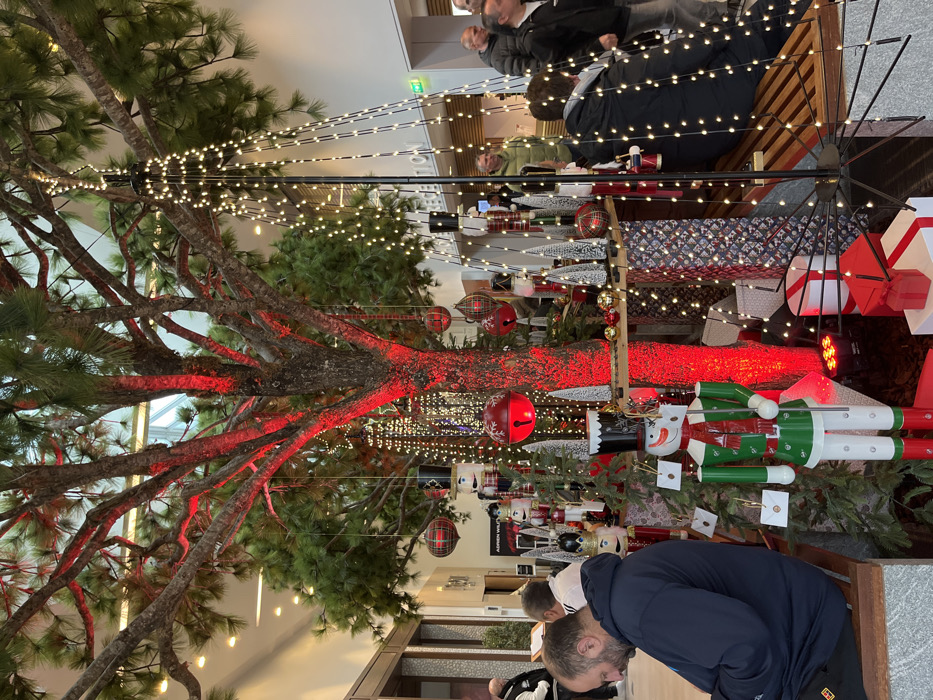 This image depicts an indoor public space, specifically within the city of Ribeauvillé, France, decorated for a holiday season. A large, natural tree with green foliage and a brown trunk stands centrally, illuminated from its base with a strong red light. The tree trunk and branches are adorned with various Christmas decorations, including hanging plaid spherical ornaments, large red bells, and numerous small, clear string lights. Around the base of the tree, an elaborate display features multiple nutcracker figures of varying sizes, miniature white and silver Christmas trees, and wrapped gift boxes with red ribbons. A prominent, large wooden nutcracker figure, painted green, white, and red, stands in the foreground, with small envelopes hanging from a nearby branch. To the right of the central tree, a tall, black pole adorned with warm white string lights creates a conical, tree-like structure. Several individuals are present in the scene. In the lower-left foreground, a man with a beard, wearing a dark blue hooded sweatshirt and black shorts, sits on a wooden bench, looking downwards. In the mid-ground, another man in a white and black striped shirt is partially visible behind the first man. Further to the right, other individuals, predominantly men in casual winter clothing such as jackets and coats, are standing or seated on another wooden bench, with some looking towards the right side of the frame. The background reveals a modern architectural setting with high ceilings, recessed lighting, and what appears to be a "RECEPTION" sign on a wall. The overall impression is one of a festive, bustling indoor area.