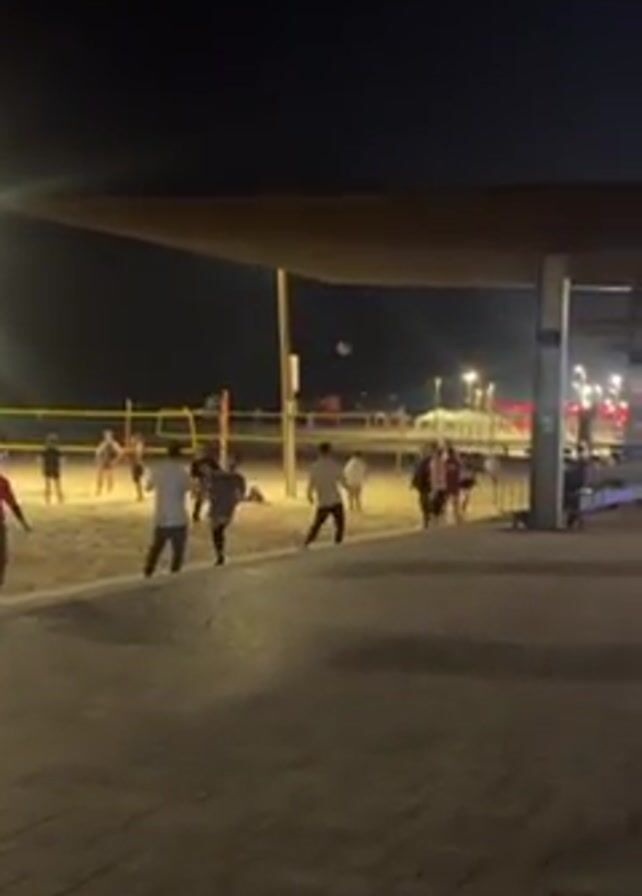 At night, people are playing volleyball on a sand court next to a paved pathway