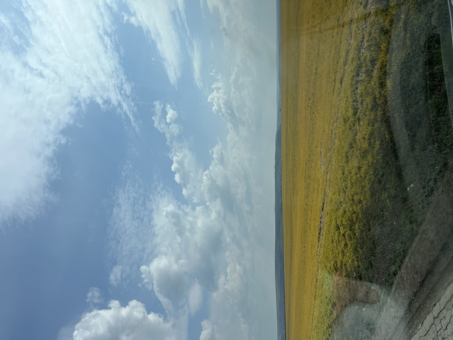 The image depicts an expansive rural landscape located in the vicinity of Sofronievo, Bulgaria. The scene is dominated by a vast, flat to gently undulating field of yellowish-green vegetation, likely crops or dry grass, extending from the foreground to a distant horizon line. In the far distance, a dark, low-lying band suggests hills or elevated terrain. The sky occupies approximately the upper two-thirds of the frame, displaying a light blue hue with numerous scattered white clouds, ranging from small, wispy formations to larger, more defined cumulus types. Sunlight is evident, casting bright areas and subtle atmospheric haze across the sky. The bottom left corner reveals a fragmented section of dark, cracked pavement, suggesting the presence of a road or shoulder immediately adjacent to the field. No individuals, animals, specific man-made structures beyond the pavement, or explicit actions are visible within the frame. Slight glare or reflections are present across the image surface, consistent with a photograph taken through a window.