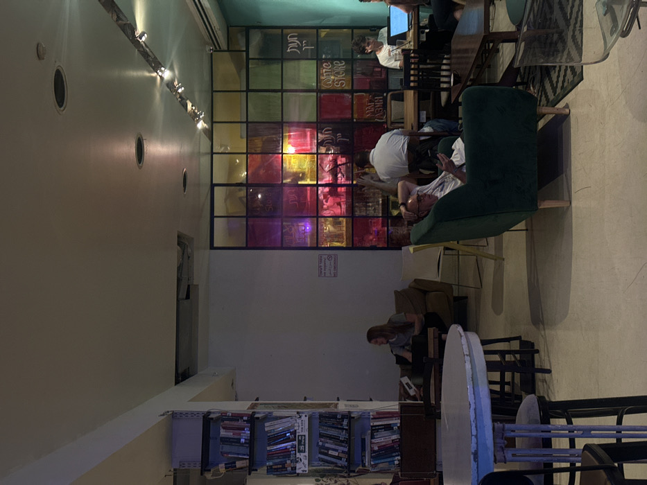 The image depicts an indoor scene within a cafe or co-working space located in Tel Aviv, Israel. The setting is dimly lit by various artificial light sources, including recessed ceiling lights and a track light fixture illuminating a wall on the right. The left side of the frame features two tall, white metal shelving units mounted against a light grey wall, both densely filled with books. In the mid-ground, a female individual with long, light brown hair, wearing a grey t-shirt, is seated on a brown sofa, facing a laptop positioned on a small wooden table. Her attention is directed towards the screen. The foreground is dominated by a round, distressed white-topped table with dark stools. Further right, a male individual, appearing middle-aged, wearing glasses and a white short-sleeved shirt, reclines in a dark green velvet armchair with wooden legs. His left arm rests behind his head, and he holds a smartphone in his right hand, looking towards the right. A dark patterned rug is visible beneath the armchair and a low wooden coffee table in front of it. The right side of the space is characterized by a prominent, floor-to-ceiling partitioned wall composed of numerous square and rectangular glass panels in varying vibrant colors, including purple, red, yellow, and green. Some panels display text in Hebrew characters, and one clearly visible panel on the upper right reads "Coffee Store" in English. Below this colorful wall, a "NO SMOKING" sign, written in both English and Hebrew ("אין עישון"), is affixed to a white wall section. Further in the background, to the right, are additional patrons. One male individual is seen from the back, wearing a white collared shirt, seated at a wooden table. To his right, a young male individual with curly dark hair, wearing a white t-shirt, is seated at another wooden table, focused on an open laptop. An air conditioning unit is visible on a light blue/teal wall section in the far right corner. The floor throughout the area appears to be a light-colored concrete or tile. The ceiling shows some exposed structural elements and an opening above the bookshelf area.